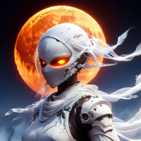 The image features a character wearing futuristic armor, predominantly white with black and gray accents. On the helmet, there is an intricate design resembling eyes or headlamps. The character has a long flowing hair-like material or fabric that matches the colors of the armor, which suggests motion as if it's being blown by wind. The setting appears to be at night with a full moon in the background, illuminating the scene with its bright light. The style of the image is reminiscent of science fiction artwork, characterized by detailed mechanical elements and realistic depiction of futuristic attire.