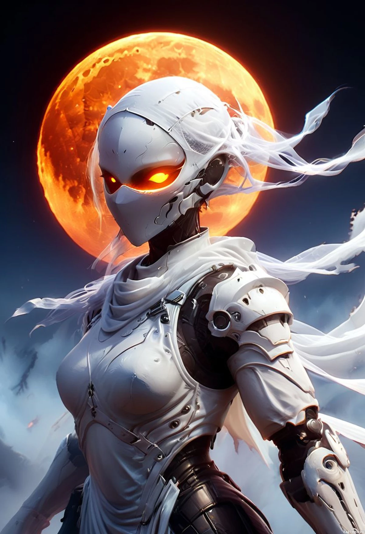 На картинке изображен персонаж в футуристической броне, преимущественно белого цвета с черными и серыми акцентами. На шлеме – сложный узор, напоминающий глаза или фары. У персонажа длинные, развевающиеся пряди, похожие на волосы или ткань, в тон броне, что создает ощущение движения, будто их колышет ветер. Действие происходит ночью, на заднем плане – полная луна, заливающая ярким светом всю сцену. Стиль картинки отсылает к научно-фантастическому искусству, характеризующемуся детальной проработкой механических элементов и реалистичным изображением футуристической одежды.