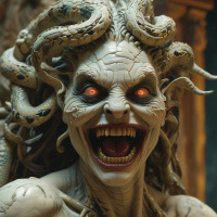The image features a character that appears to be a blend of human and monstrous elements. On the left side, there is a face with red eyes that has a wide, open-mouthed smile displaying sharp teeth. The right side of the face merges into what seems to be a long, coiled snake body adorned with intricate patterns. The upper portion of this snake-like feature transitions into a human head complete with hair, but it retains the serpentine quality through the textures and colors that blend between the human features and the snake scales. The character is not wearing any clothing or accessories that are visible in the image. The background is nondescript, providing no additional context about the setting or environment in which this figure resides. The style of the image suggests it could be a sculpture or a figurine from a science fiction or fantasy genre, possibly inspired by classical mythology, as indicated by the reference to Medusa, the Gorgon from Greek mythology.