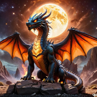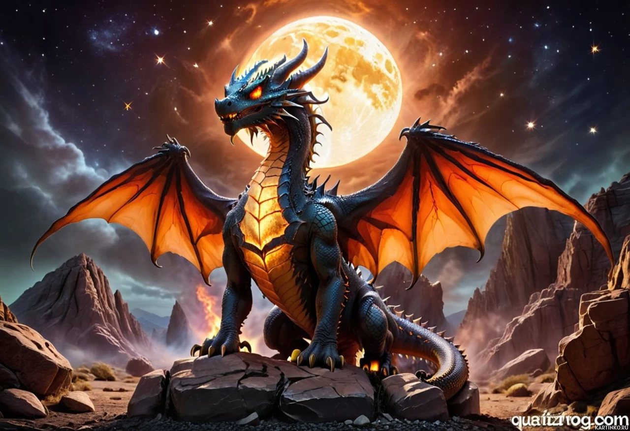 rock formations that could suggest a desert-like environment or an otherworldly terrain. There are also hints of vegetation and the silhouette of structures that might be ruins or natural formations. The color palette is dominated by shades of orange, blue, and purple, which contribute to the magical atmosphere of the scene. The lighting effects on the dragon and around the moon suggest a focus on creating an ethereal and mystical ambiance in the artwork.