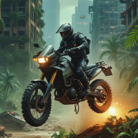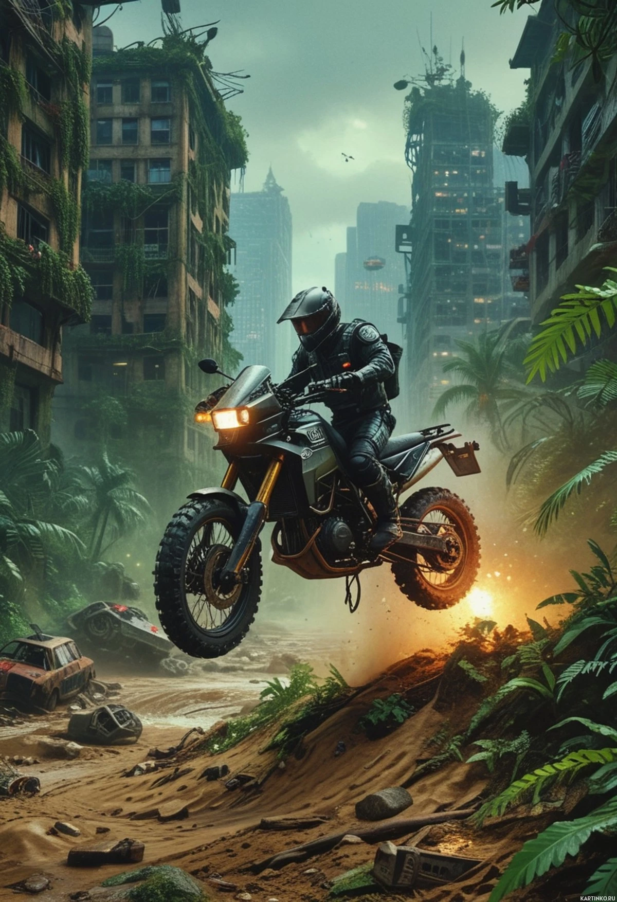 Мотоциклист, бросающий вызов судьбе на фоне увядающего города Картинки с такими же тегами