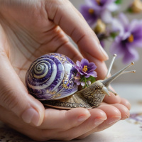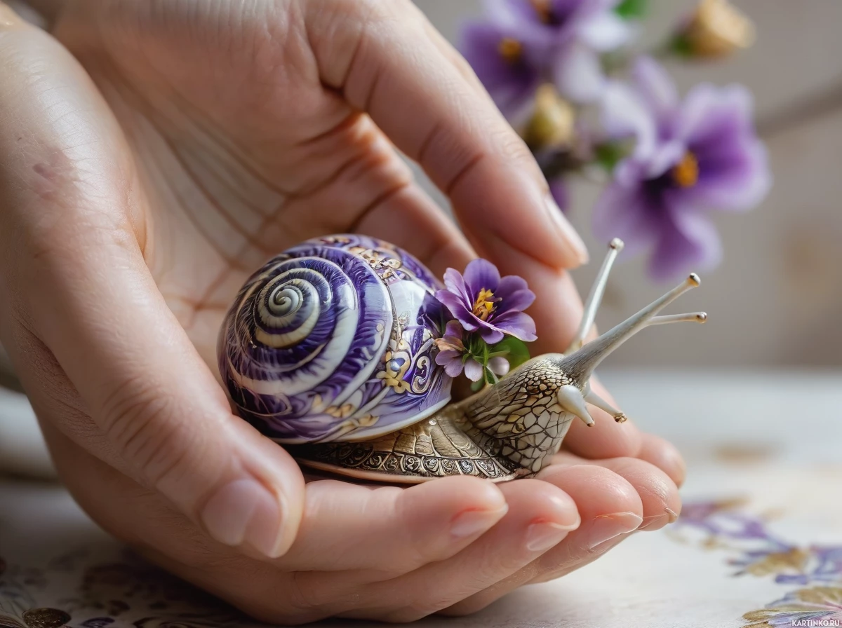 На картинке крупным планом показаны две руки, бережно держащие маленькую раковину улитки, украшенную фиолетовым и золотым, с лепестками цветов вокруг. На заднем плане видны настоящие цветы.