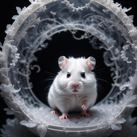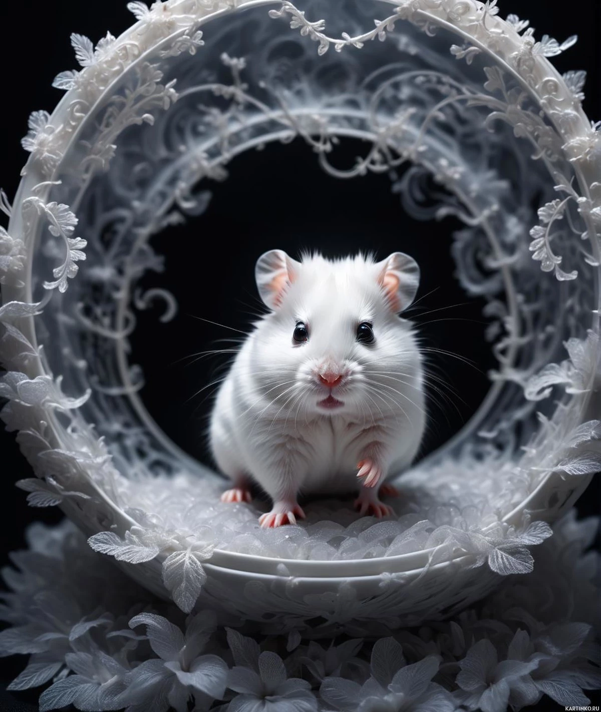 На картинке изображено маленькое белое животное, удобно устроившееся внутри замысловатой конструкции в форме кольца, напоминающей круглую рамку. Судя по его компактному телу и длинным усам, это хомяк или песчанка. Кольцо украшено растительными узорами, придающими ему естественный вид, словно созданный для имитации окружающей среды. Фон картинки чёрный, что создаёт контраст с главным объектом и выделяет детали рамки и животного внутри. Стиль фотографии напоминает жанр натюрморта, известного своим вниманием к деталям и эстетикой.