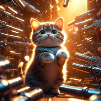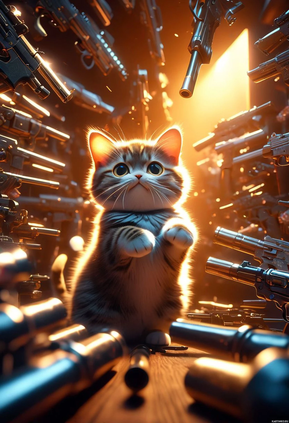 The image shows a cat with a surprised expression. The cat has striped fur and a brightly colored nose. It appears to be sitting on what looks like an old wooden floor, surrounded by numerous guns lying around it. The background is dark and contrasting with the glow of light coming from the top, which illuminates part of the scene.