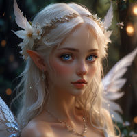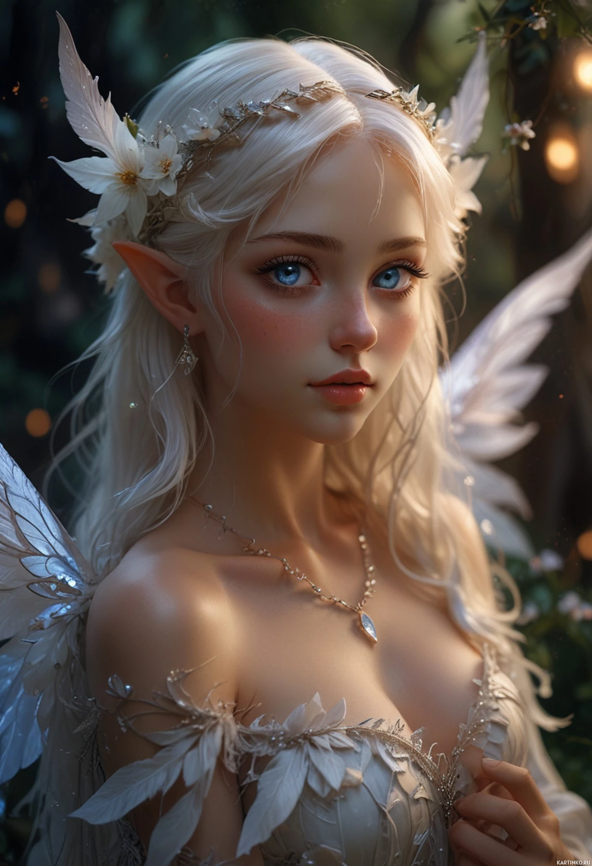 The image features a digital artwork of an elf with white hair and blue eyes, wearing a fantasy-style outfit that includes wings. She is set against a magical forest background with light effects that give the scene a mystical atmosphere.