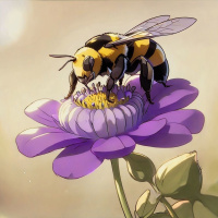 На картинке пчела взаимодействует с цветком. У пчелы отчетливо видны черные и желтые полоски, характерные для этого вида, а крылья расправлены. Она расположилась на фиолетовом цветке с белыми деталями. Фон мягко размыт, что создает ощущение естественного, открытого пространства, возможно, сада или луга. Освещение мягкое и рассеянное, придающее сцене умиротворенную атмосферу.