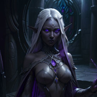 The image depicts a fantasy scene featuring an elven character known as Drow, which are dark elves in the fantasy genre. The Drow is adorned with intricate armor and jewelry that suggest a magical or high-ranking status within her society. She has pointed ears indicative of her elven nature and striking violet eyes. The character's expression is intense, and she appears to be in motion, possibly walking through an environment with stone steps leading up to a grand archway that suggests an ancient or mystical setting. The color palette is dominated by dark tones that emphasize the fantasy theme, with splashes of purple adding a touch of color accentuating her elven features and attire.