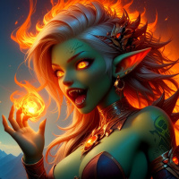 The image depicts a character from the fantasy genre. She has long blonde hair and pointed ears, typical features of elven lore. Her eyes are glowing with a red hue, which adds to her mystical appearance. She is wearing elaborate armor adorned with intricate designs that resemble flames or magma, suggesting she may be a warrior or guardian associated with fire. The background appears to be a fiery landscape with volcanic activity and clouds of smoke, enhancing the fantastical atmosphere of the image.