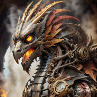 На картинке изображён персонаж, представляющий собой смесь фэнтези и робототехники. У него гуманоидная форма с интегрированными роботизированными элементами. Лицо напоминает драконье — с чешуёй, глазами и открытым ртом, обнажающим острые зубы. Персонаж одет в доспехи или конструкции, похожие на доспехи, которые покрывают его тело и голову. Доспехи словно сделаны из металла и украшены замысловатыми узорами, среди которых видны шестерни и механические детали. В одной руке он держит небольшой светящийся предмет, похожий на огонь или искру. Фон указывает на интерьер с элементами классической архитектуры, такими как арки и колонны. Общий стиль картинки тяготеет к фэнтези с элементами стимпанка.