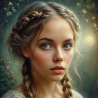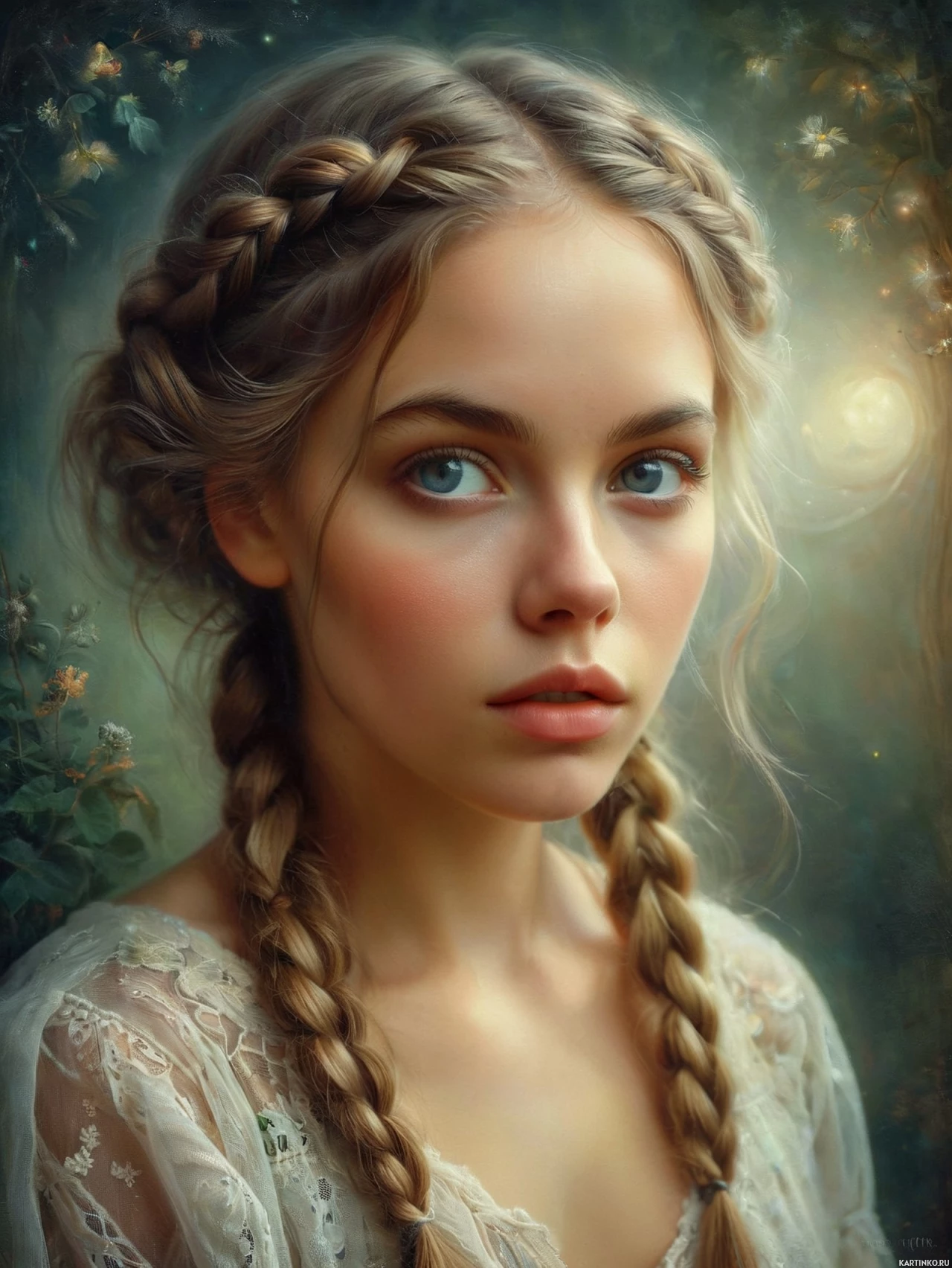 На картинке запечатлена молодая женщина со светлой кожей и светло-голубыми глазами. У неё длинные, прямые светлые волосы, зачёсанные на пробор, заплетённые в косички. Она смотрит немного в сторону, от зрителя, с нейтральным выражением лица. Макияж деликатный, подчеркивающий глаза и губы, с лёгким румянцем на щеках. На ней наряд, выполненный в стиле определённой эпохи, с высоким воротником и кружевной отделкой. На заднем плане – ночной пейзаж со звёздным небом и силуэтами деревьев и растительности, намекающими на лес или сад, освещённые тёплым светом, возможно, лунным или магическим.