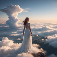 The image depicts a person standing on a rocky outcrop with a dress that trails behind them, suggesting movement or a gentle breeze. The individual appears to be looking off into the distance towards a body of water and clouds. Above the landscape, there is a large cloud formation resembling an island or mountain with a volcanic crater on top. The sky transitions from daylight at the horizon to night sky, indicating either dawn or dusk.