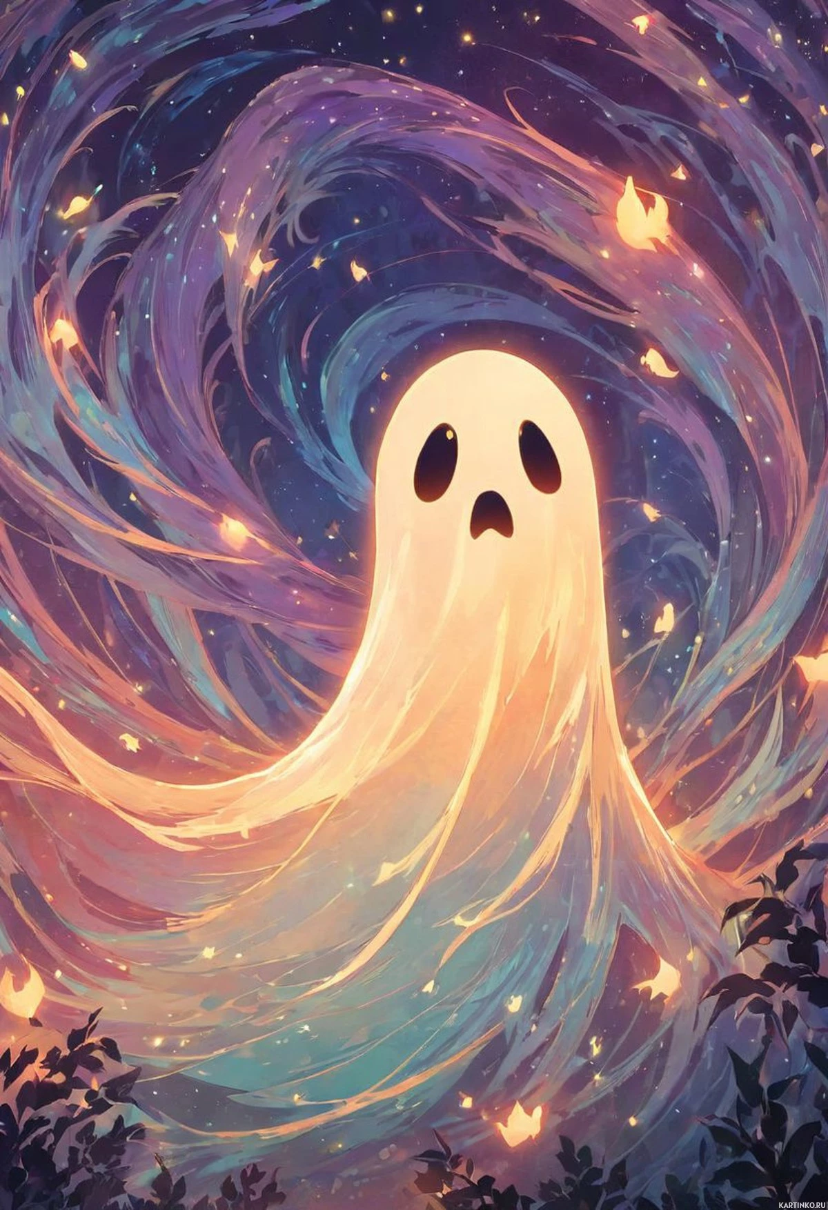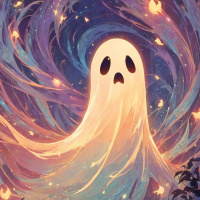 a ghostly figure as its central subject. The ghost has white ethereal features with flowing, almost liquid-like hair that transitions from dark to light hues. It appears to be emerging from the depths of