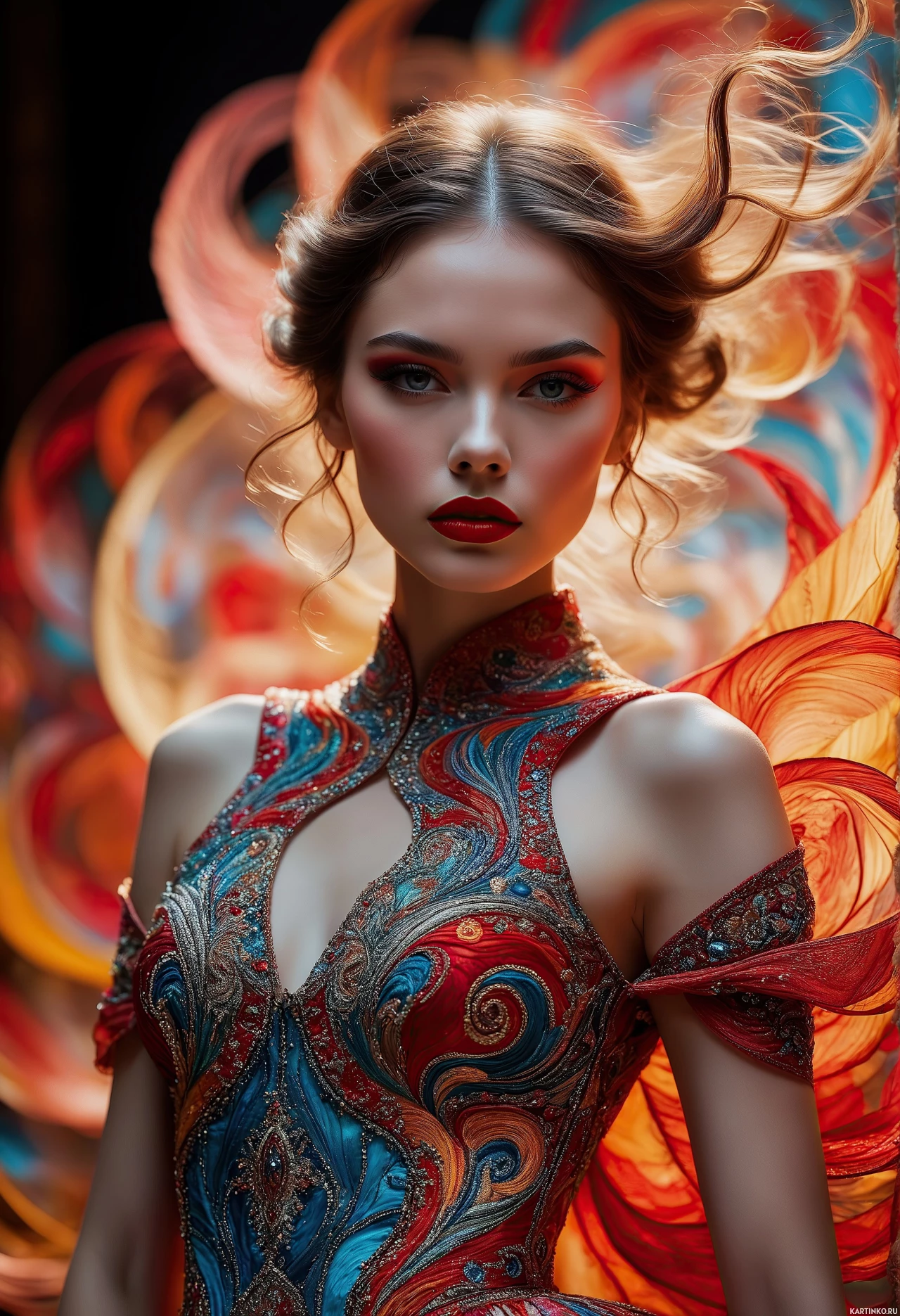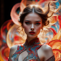 The image depicts a woman in an ornate costume with vibrant colors and intricate designs that appear to be inspired by Asian fashion, specifically traditional Chinese attire. She has red makeup on her eyes and lips, which contrast with her fair skin. Her hair is styled in a way that suggests a wind-like effect, adding a dynamic element to the composition. The lighting on her face creates a dramatic and intense look. The background is dark and features what appears to be abstract red flames or patterns, enhancing the overall theatrical and vivid atmosphere of the image.
