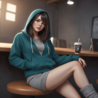 In the image, a young woman with short brown hair is seated on a high stool in what appears to be a modern café. She's wearing a gray hoodie and has a neutral expression on her face. On the table in front of her is a cup that looks like it might contain coffee or another hot beverage, accompanied by what seems to be a pastry. The background suggests an indoor setting with ambient lighting that gives off a cozy vibe.