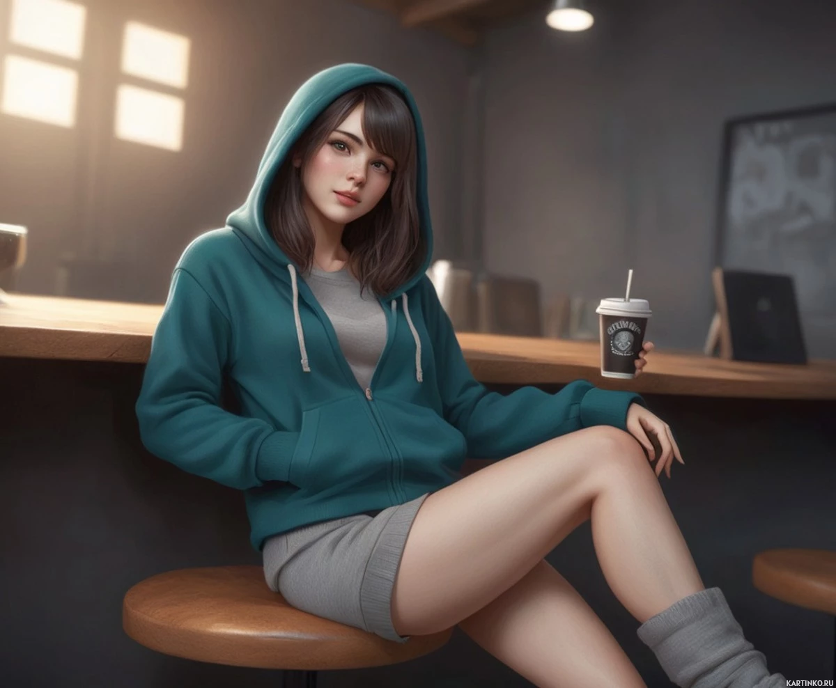 На картинке молодая женщина с короткой каштановой стрижкой сидит на высоком стульчике в современном кафе. На ней серый худи, а на лице – спокойное выражение. На столе перед ней чашка, возможно, с кофе или горячим напитком, рядом с чем-то вроде выпечки. Задний план указывает на внутреннее помещение с мягким, уютным освещением.