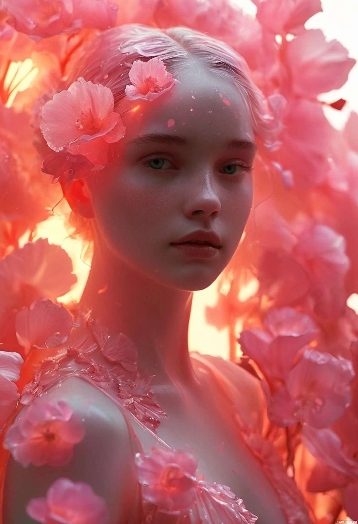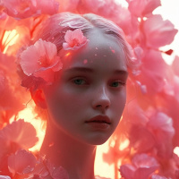 На картинке изображена молодая девушка с розовыми волосами, окружённая цветущими розовыми цветами вишни. У неё нейтральное выражение лица, и она смотрит прямо на зрителя. Кожа выглядит слегка сияющей, а макияж включает в себя аккуратный контуринг вокруг глаз, которые усилены, кажется, цифровыми эффектами, придающими им более выразительный вид. Фон тёмный, создавая резкий контраст, который подчёркивает яркость цветов и её лица. На ней одежда, выполненная в розово-белых тонах, сочетающаяся с цветочным мотивом.