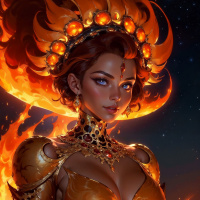 The image features a stylized female character with a fantasy theme. She has long hair and is adorned with ornate headgear that resembles flames, suggesting she may be a deity or character of significant power within her narrative. Her attire includes a corset-style top with intricate designs, possibly made of gold or similar material, and additional golden accents on her arms. The backdrop is a dark, starry sky, which adds to the otherworldly ambiance of the image. There are flames emanating from the headgear, reinforcing the character's fiery nature. Her expression is neutral with a hint of seriousness or contemplation.
