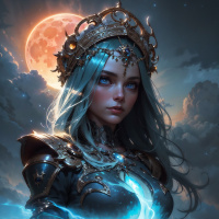 The image features a female character with turquoise hair and an ethereal appearance. She has a regal headdress adorned with what appears to be a blue gem or jewel, and she's wearing armor that includes a breastplate and gauntlets. Her attire is intricately designed with a mix of metallic colors like gold and silver, and the armor has an ice-like quality with a translucent effect. The setting appears to be nighttime, as suggested by the illumination of the crescent moon in the sky. The background is dark, enhancing the mystical ambiance. There's a whimsical element to the character's design, with what looks like a small wing or feather-like accessory near her left shoulder. The image is rich in detail and color contrast, highlighting the fantasy genre it belongs to. The overall mood of the picture is serene yet majestic, fitting within the realm of fantasy artwork.