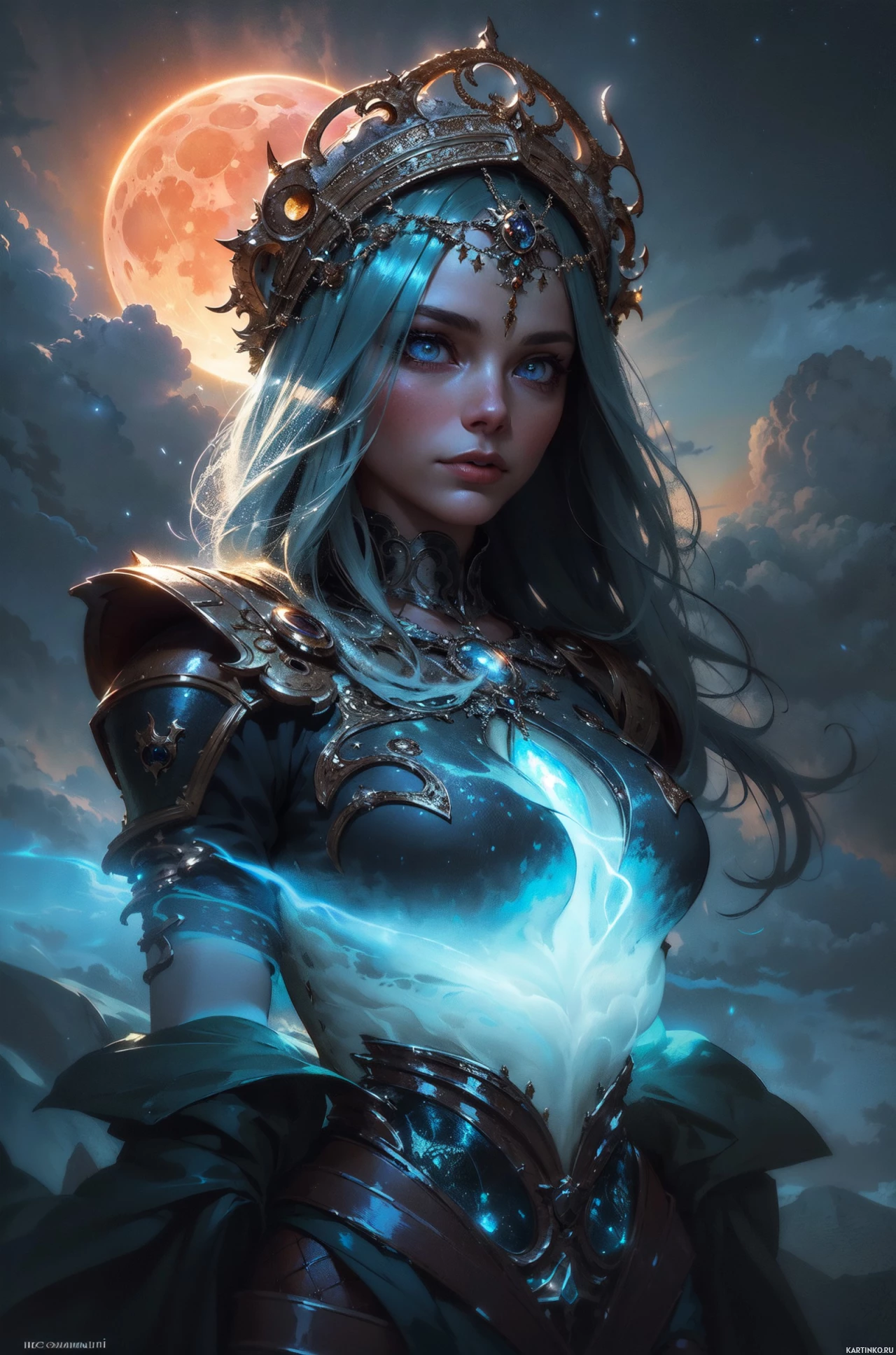 На картинке изображена девушка с бирюзовыми волосами и неземной красотой. На ней царственный головной убор, украшенный, по всей видимости, синим камнем или драгоценным камнем. Она одета в доспехи, включающие нагрудник и наручи. Ее наряд искусно выполнен в сочетании металлических оттенков, таких как золото и серебро, а доспехи имеют ледяное сияние с полупрозрачным эффектом. Судя по освещению полумесяца в небе, действие происходит ночью. Темный фон усиливает мистическую атмосферу. В дизайне персонажа есть что-то сказочное – кажется, у нее небольшой крылышко или перышко возле левого плеча. Картинка насыщена деталями и цветовыми контрастами, что подчеркивает принадлежность к жанру фэнтези. Общее настроение – спокойное и величественное, характерное для фэнтезийных работ.