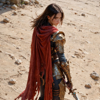 intricate designs on the blade, and she's looking off to the side with a focused gaze, as if she's noticing something or someone that isn't directly visible in the photo. The setting appears dry and barren, suggesting a harsh environment, which contrasts with her armored attire and the sword, creating an interesting juxtaposition between