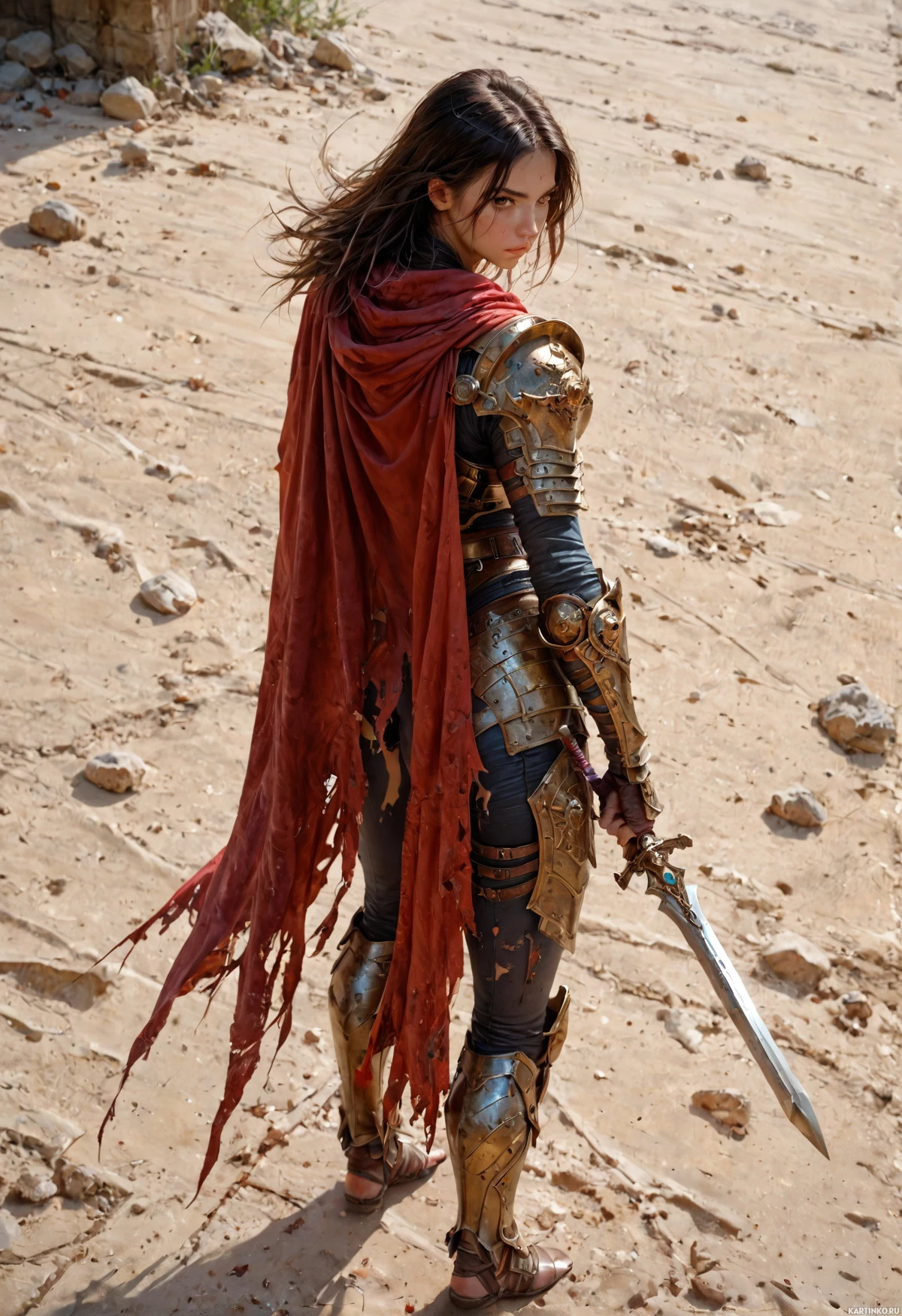 The image features a woman standing in a desert-like environment. She is wearing a medieval-style armor and a long, ragged cloak that appears worn and weathered. Her hair is styled in