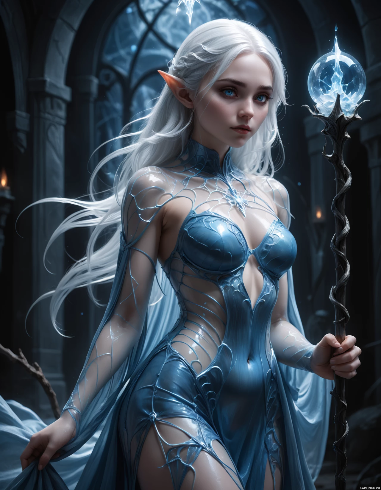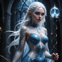 intricate armor that resembles ice or crystalline material. In one hand, she holds a staff that also seems to be made of the same crystalline substance. The setting appears to be a dimly lit chamber with