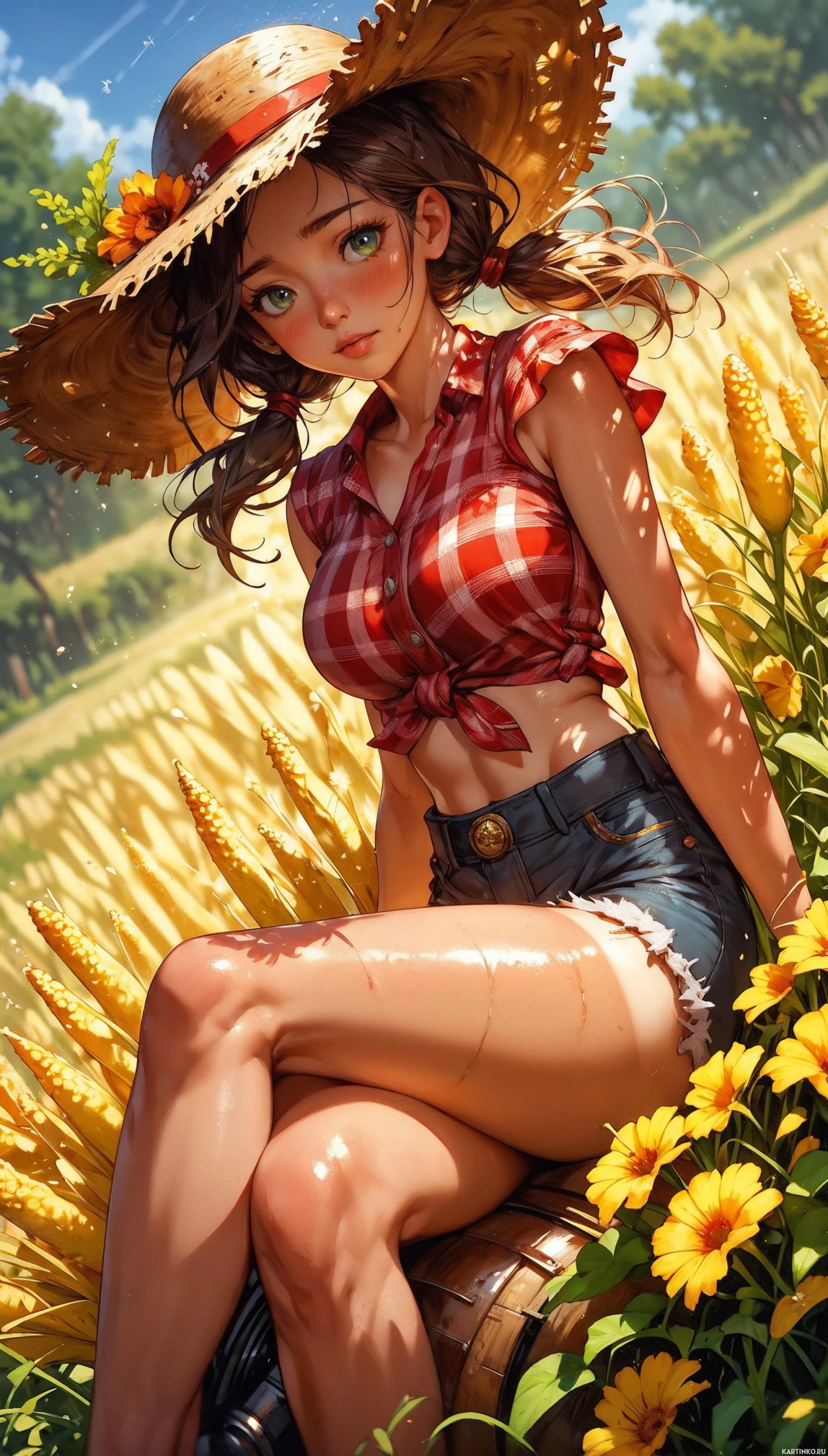 На картинке изображена трехмерная модель девушки, сидящей на поле с высокими желтыми цветами. У нее длинные волосы, забранные в хвост, и на ней ковбойская шляпа с красной отделкой, джинсовая рубашка с жемчужными пуговицами и выцветные джинсы. Её поза выглядит небрежной, словно она позирует для фотографии. На заднем плане трава и еще больше ярких желтых цветов, что говорит о солнечном дне в сельской местности.