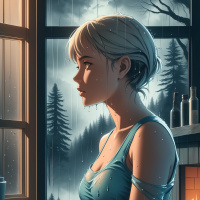 На картинке женщина с светлыми волосами сидит у открытого окна. Она сцепила руки и смотрит на дождёную ночную сцену с деревьями. На ней голубая блузка, и кажется, она задумалась или погружена в размышления. Комната, в которой она находится, кажется тускло освещена, в отличие от яркости снаружи, где лунный свет отражается от мокрой поверхности. Окно обрамлено деревянными панелями, что добавляет деревенской атмосферы обстановке.