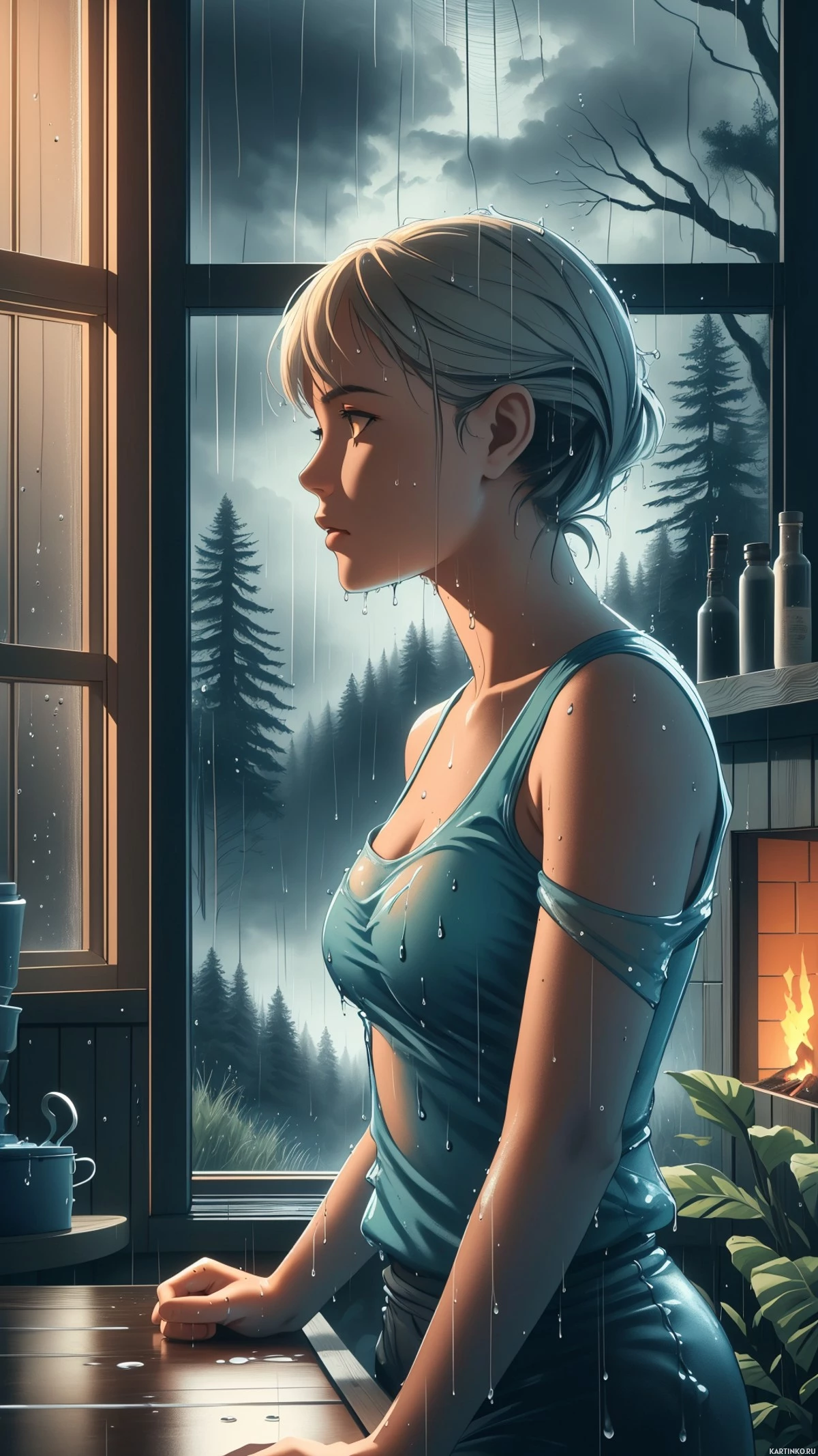 дождь | Фотки и рисунки с дождём | Rain | Иллюстрация в стиле: девушка с мокрыми волосами смотрит в окно