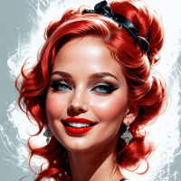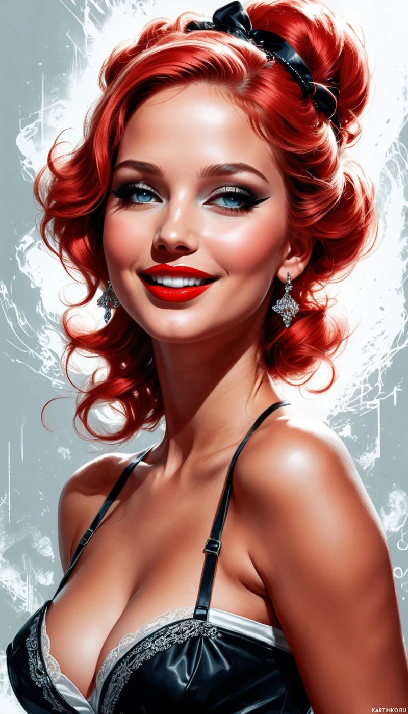 The image features a person with bright red hair styled in an updo adorned with what appears to be small flowers or decorations, giving the appearance of a halo around the head. The individual is wearing a black corset and has visible cleavage. They are smiling broadly at the viewer, displaying teeth that could be considered overbite due to their protrusion from the upper lip.