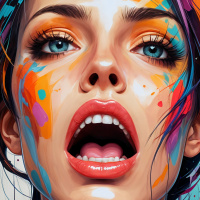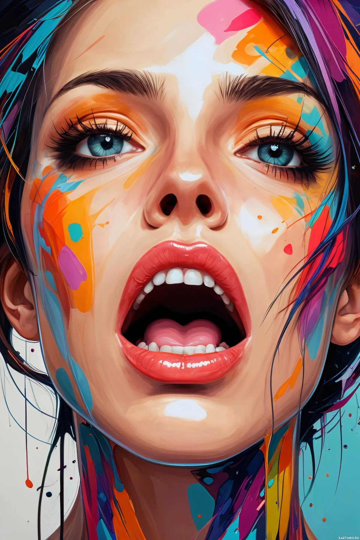 На картинке запечатлена молодая женщина с ярким, разноцветным всплеском краски на лице и теле. У нее поразительные голубые глаза, выделяющиеся на фоне буйства красок. Ее волосы окрашены в несколько цветов, что добавляет живости всей композиции. Краска, кажется, стекает с лица, создавая ощущение динамики и энергии.
