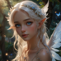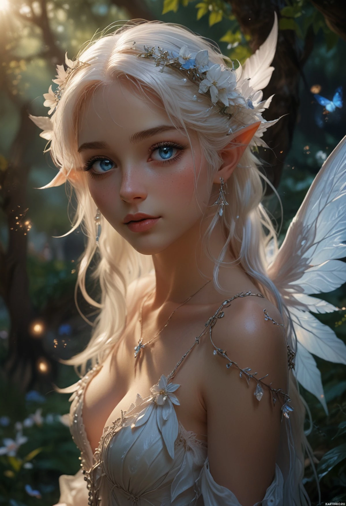 На картинке изображена персонаж, похожая на эльфийку, с белыми волосами и заостренными ушами, одетая в наряды в фэнтезийном стиле. У неё большие голубые глаза с ресницами и выразительные черты лица: румяные щечки, пухлые губы и изящный нос. Волосы уложены в свободные волны, ниспадающие на плечи. На ней множество украшений, характерных для фэнтези: крылья на спине, будто прикрепленные к лопаткам, и полупрозрачная одежда с замысловатой кружевной отделкой и украшениями. Выражение лица нейтральное, губы слегка приоткрыты, будто она собирается что-то сказать. Фон предполагает заколдованный лес, освещенный мягким светом, подчеркивающим неземную атмосферу.