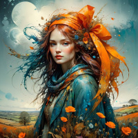 The image features a young woman with striking makeup and hair, giving her an otherworldly appearance. She has purple eyeshadow that matches the color of her lips, which are also colored in the same hue. Her eyebrows are arched slightly upwards. The woman is wearing a vibrant orange headband adorned with a large feather on one side. She has long hair that appears to be a mix of colors, including blues and purples. A few flowers are strewn across her hair, adding to the fantastical nature of her look. Her skin tone is fair. She's wearing a light-colored top with a high collar, which looks like it might be part of a jacket, given its buttoned front. Around her neck, she has on a blue scarf that appears to be made from an old map or book page, with some writing visible on it, although the text is too small and blurry to read clearly. The background is a pastel-colored field dotted with poppies. The sky above is overcast, with clouds scattered across it. The overall style of the image suggests it might be a digital artwork or illustration designed to portray a character from a fantasy or otherworldly genre.