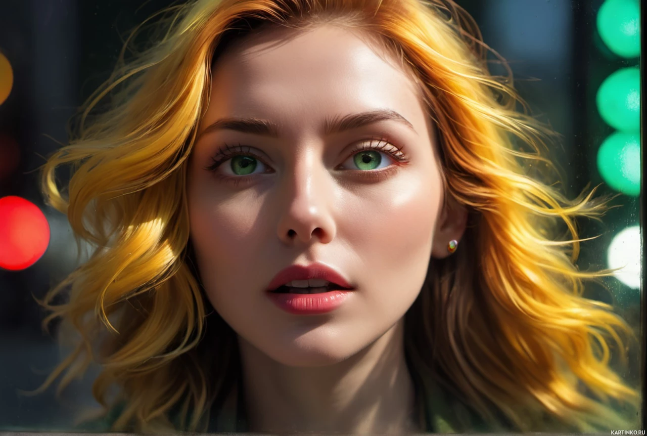 The image features a young woman with fair skin and hazel eyes. Her hair appears to be of a light brown hue, styled in loose waves that fall just past her shoulders. She has a light contouring of her cheeks and lips, which gives her complexion a rosy glow. The girl's eyebrows are well-defined and match the color of her hair, contributing to a natural and youthful appearance. She is looking directly at the camera with a neutral expression on her face. Her gaze seems focused and clear, suggesting she may be aware that the photo is being taken. The background is out of focus but appears to be an urban setting due to the blurred shapes and colors that suggest concrete structures and possibly traffic lights.