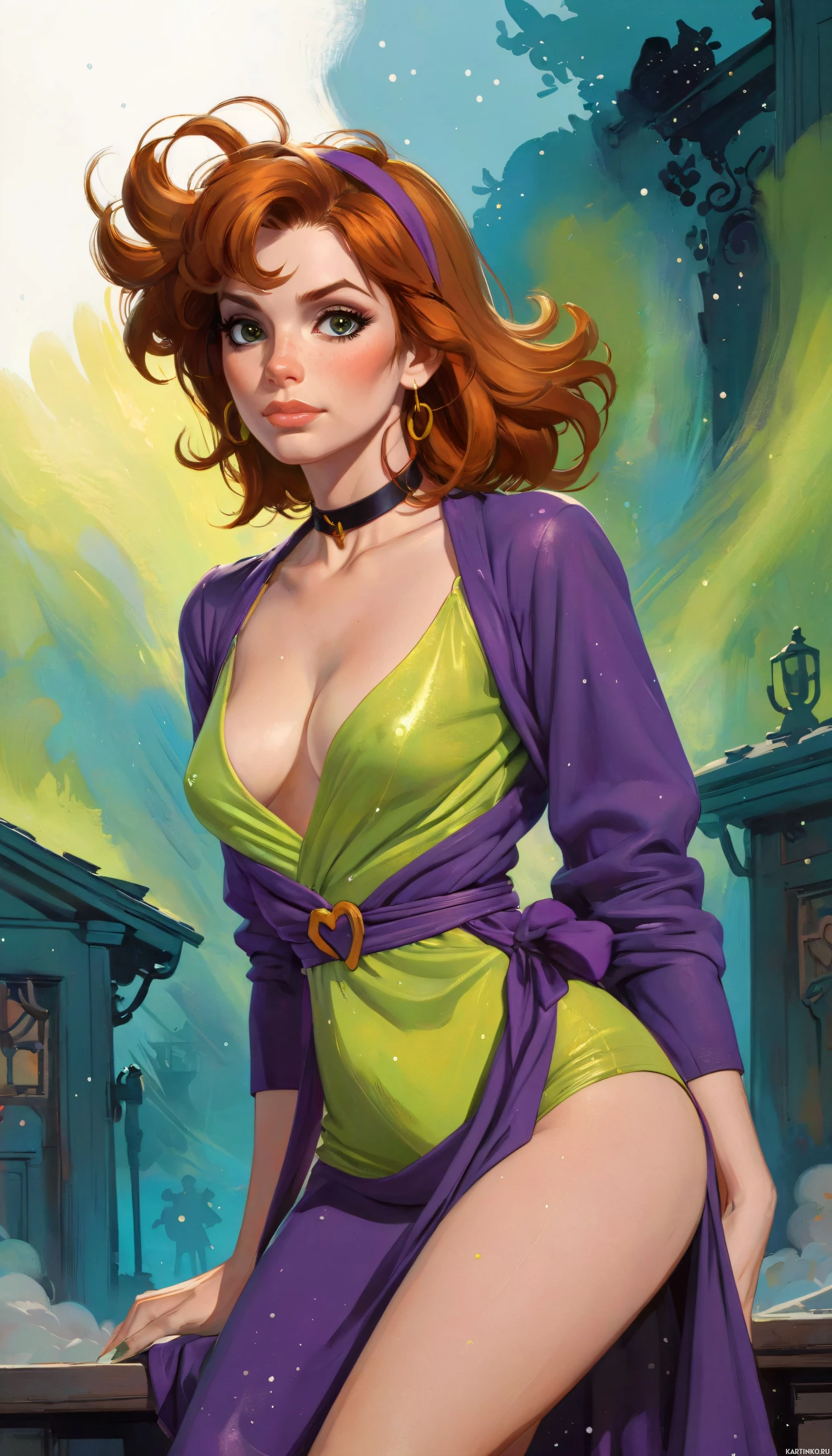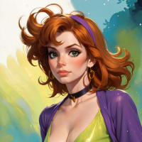 На картинке изображена рыжеволосая девушка в лиловом топе с открытой грудью и жёлтыми плавательными шортами. Она стоит на краю стены или платформы в стилизованной, возможно, цифровой арт-среде, окружённой архитектурными сооружениями. Её поза выражает уверенность и соблазнительность.