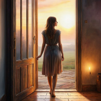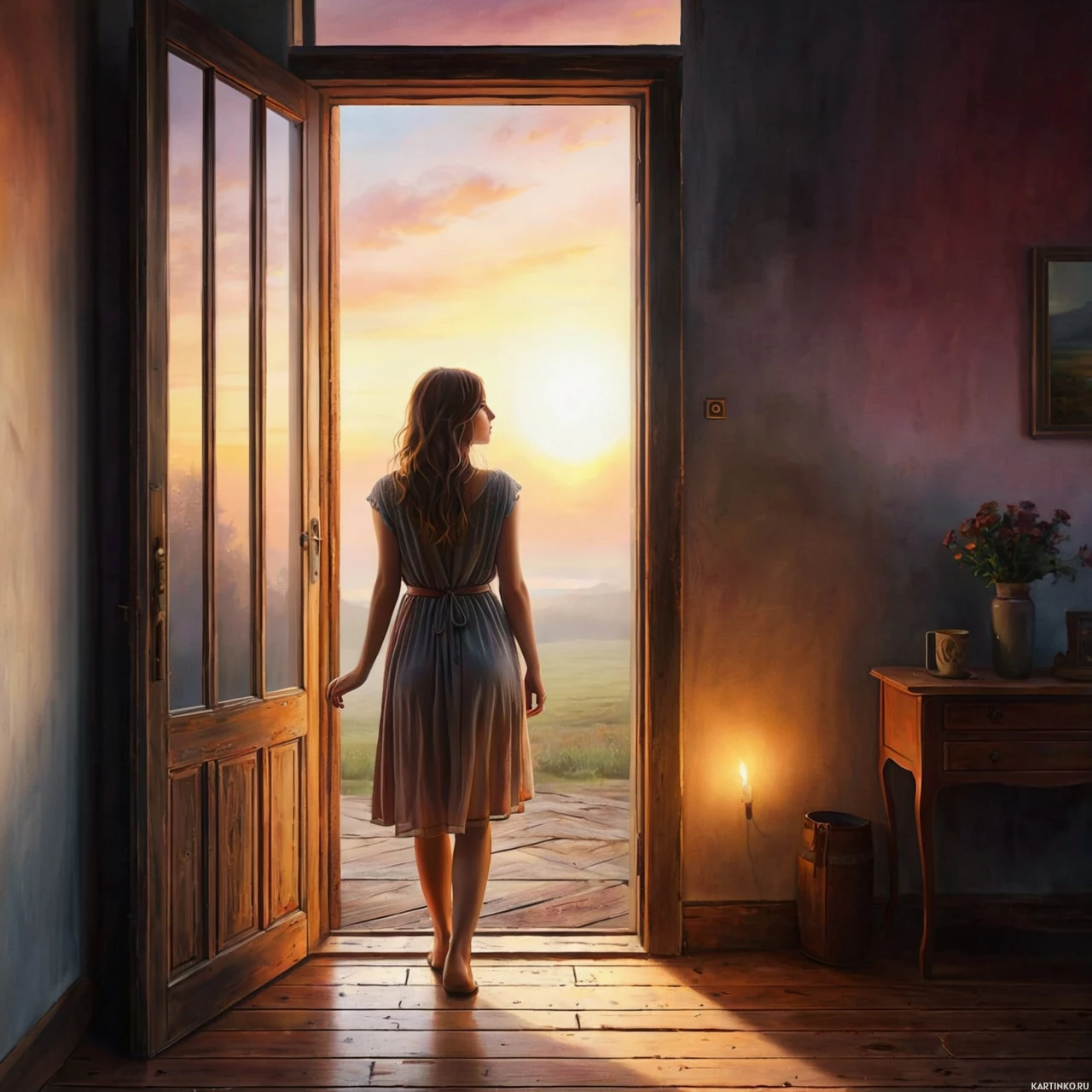 На картинке изображен человек, стоящий в открытой двери комнаты с красными и белыми стенами, напоминающими старое дерево. За дверью видна безмятежная панорама: чистое небо, сквозь которое пробиваются лучи солнца. Внизу, под этим источником света, раскинулись сочные зеленые поля и небольшая группа деревьев или кустов на горизонте. Кажется, человек смотрит на пейзаж, словно погружен в раздумья или мечты. На нем длинное платье до середины икры с высоким воротником и пышными рукавами, а волосы уложены в сложную прическу.