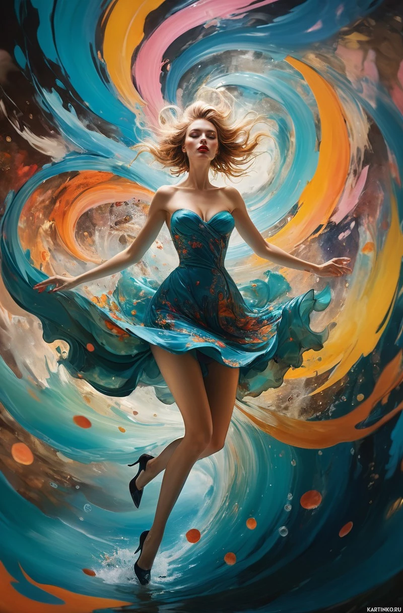 На картинке изображена женщина с закрытыми глазами. У неё светлые волосы и пышное голубое платье с перьевым декором. Её поза передаёт ощущение движения, будто она танцует или парит в воздухе. Фон картинки наполнен вихрями синих и фиолетовых оттенков, создавая ощущение плавности и динамики вокруг неё.