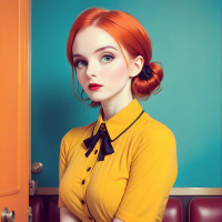This image depicts a young woman with red hair styled in two distinct sections—one on top and the other braided over one shoulder, both adorned with pink highlights. She has large expressive blue eyes and is looking directly at the camera with a neutral expression. The individual is wearing a light yellow cardigan over a darker shirt with a bow tie detail, paired with a dark blue skirt that reaches her mid-thighs. Her hands are crossed on her lap, and she is seated against a vibrant blue wall with an orange panel towards the lower part of the frame. The overall style of the image appears to be modern and fashion-oriented, with a focus on color contrast and a distinctive hair style that adds to the subject's unique appearance.