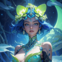 The image depicts a fantasy-style character with blue hair and fair skin. She has large eyes, which are a common feature in anime-inspired artwork. The character is adorned with intricate jewelry, including earrings and what appears to be a crown or headpiece made of flowers. Her attire consists of a top and pants that have a detailed, fantastical design, possibly suggesting some sort of armor or special clothing. The background is ethereal with floating plants and a subtle glow that seems to be emanating from the character herself, giving her an otherworldly appearance. The overall composition suggests she might be a character from a fantasy game or story.