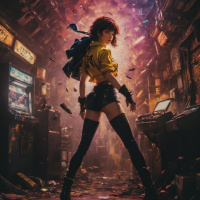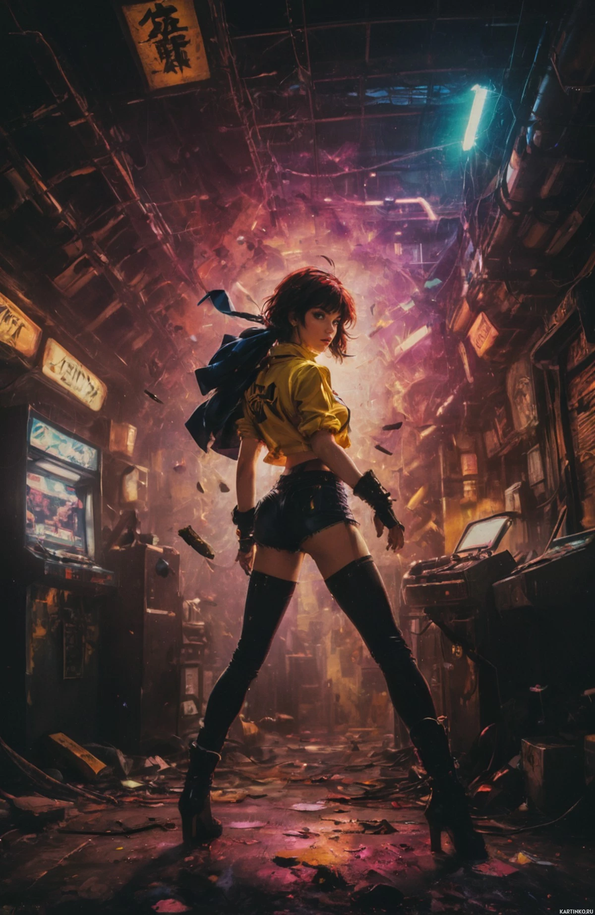 На картинке изображен персонаж, словно стоящий в городском переулке. Спина персонажа повернута к зрителю, на нем синий плащ, поверх которого накинут красный, черные кожаные штаны и черные сапоги до колен. Короткие красные волосы, руки на бедрах. На заднем плане – разбросанный мусор, среди которого экран телевизора. Общая атмосфера энергичная и немного хаотичная, с яркими цветами и мазками, создающими ощущение движения.