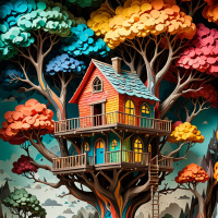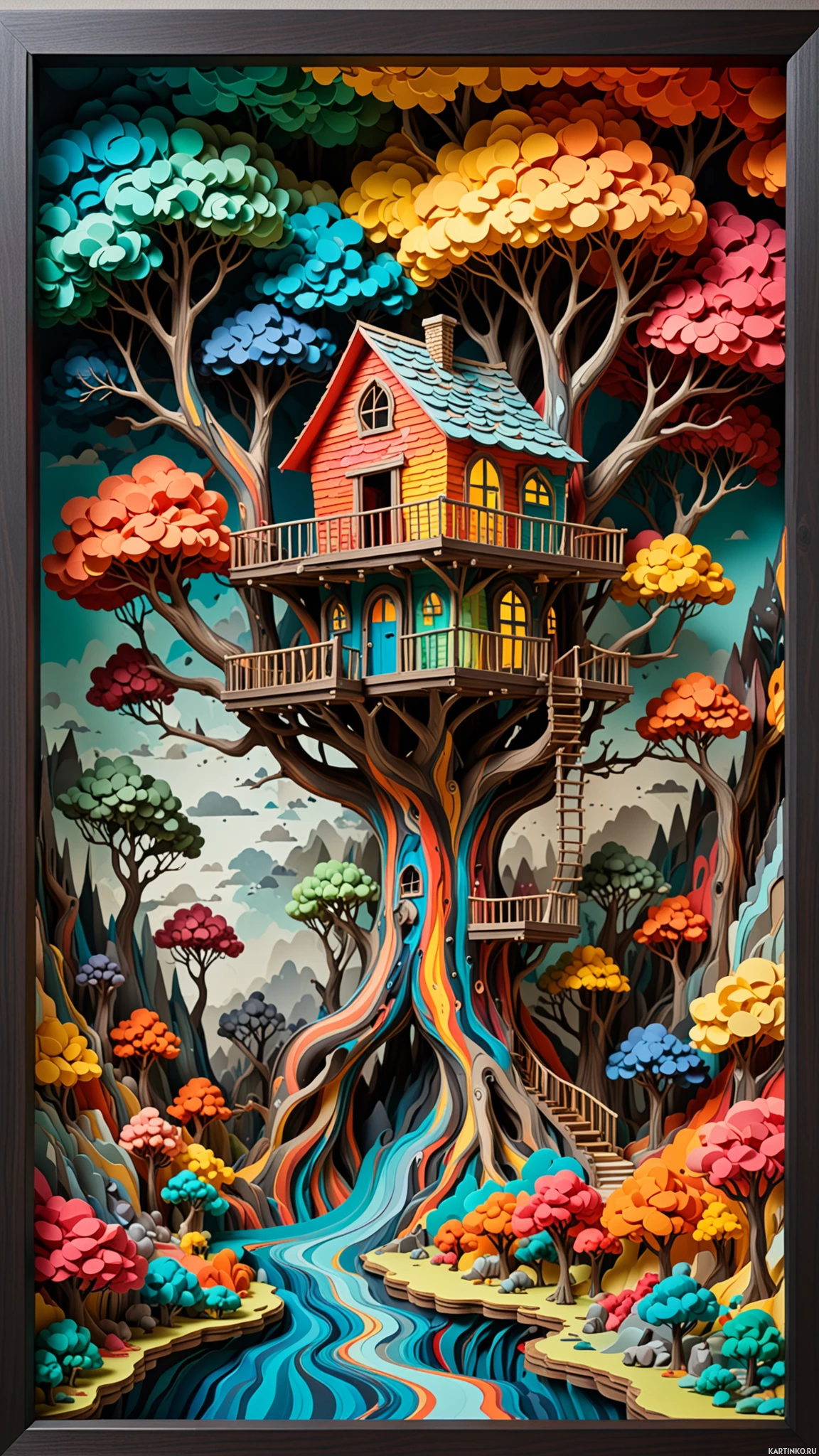 На картинке представлен яркий, детализированный рисунок в черной раме на нейтральном фоне. В центре – большое дерево насыщенных цветов, на его ветвях расположено домик. Вокруг дерева – множество других деревьев, цветы и здания. Через всю сцену протекает река всех цветов радуги, берущая начало от розового водопада и заканчивающаяся другим водным объектом. Перед домиком перекинут мост, а на заднем плане видны горы и облака. Работа выполнена очень кропотливо и выглядит как ручная работа или картина, написанная с большим вниманием к деталям.