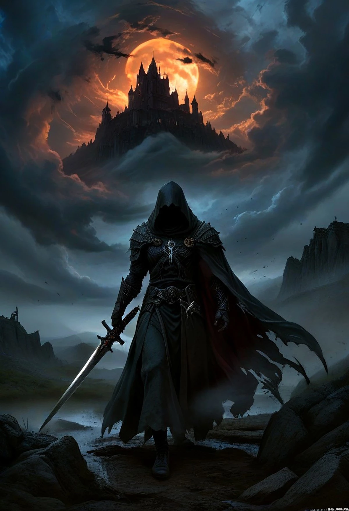 a figure in a cloak and hood is seen standing atop a rocky ledge. The figure's face is obscured by the hood, revealing only their eyes as they gaze off into the distance. They are holding a sword with both hands, gripping it firmly. The setting appears to be