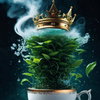 The image features a cup of tea with a plant sprouting from it, surrounded by a light mist or vapor. On top of the cup sits what appears to be a small crown. There is also a circular green substance near the base of the plant, which could be interpreted as a ring or another form of adornment. The background is dark and moody, providing contrast with the illuminated subject at its center. The tea cup has a handle on one side, and there are small leaves scattered around it.