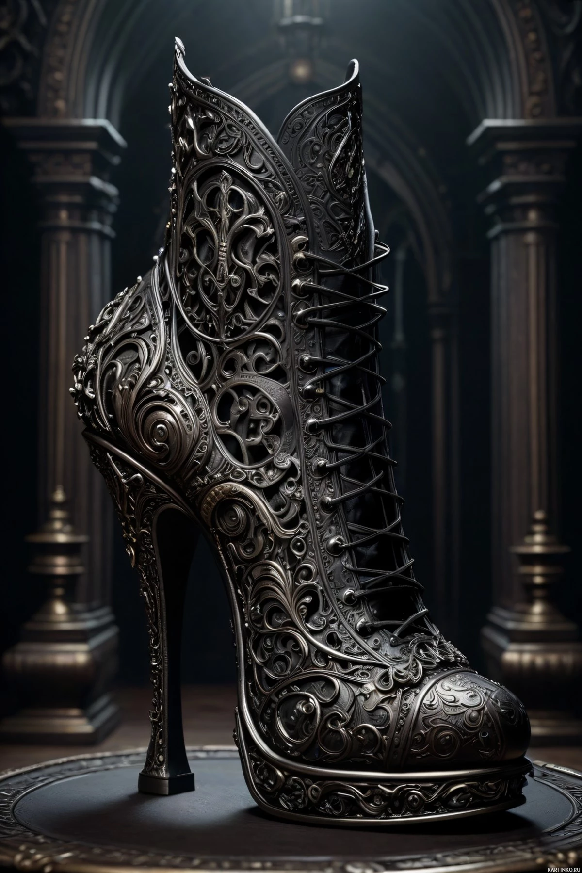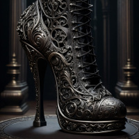 На картинке представлен одинокий сапог, выставленный в обстановке, напоминающей художественную или историческую. Сапог украшен сложным орнаментом, что говорит о высоком качестве изготовления или, возможно, о его принадлежности к костюму для персонажа с определенными эстетическими требованиями. На заднем плане видны архитектурные элементы, похожие на те, что характерны для средневековых или готических зданий, что указывает на то, что обстановка может быть задумана для создания ощущения исторического контекста или фэнтезийного дизайна.