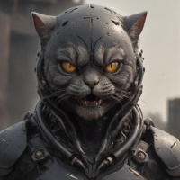 The image depicts a science fiction-themed character. At the center of the image, there is a humanoid figure with feline features such as cat ears and tail. The face appears to be a blend of human and feline, with fur texture that mimics a cat's. The figure has a mechanical chest with what looks like cables or tubes connecting different parts of the suit. The color scheme is dominated by metallic gray tones, contrasted with the natural colors of the cat-like features. The background is minimalistic, with no distinctive objects or text present in the image.