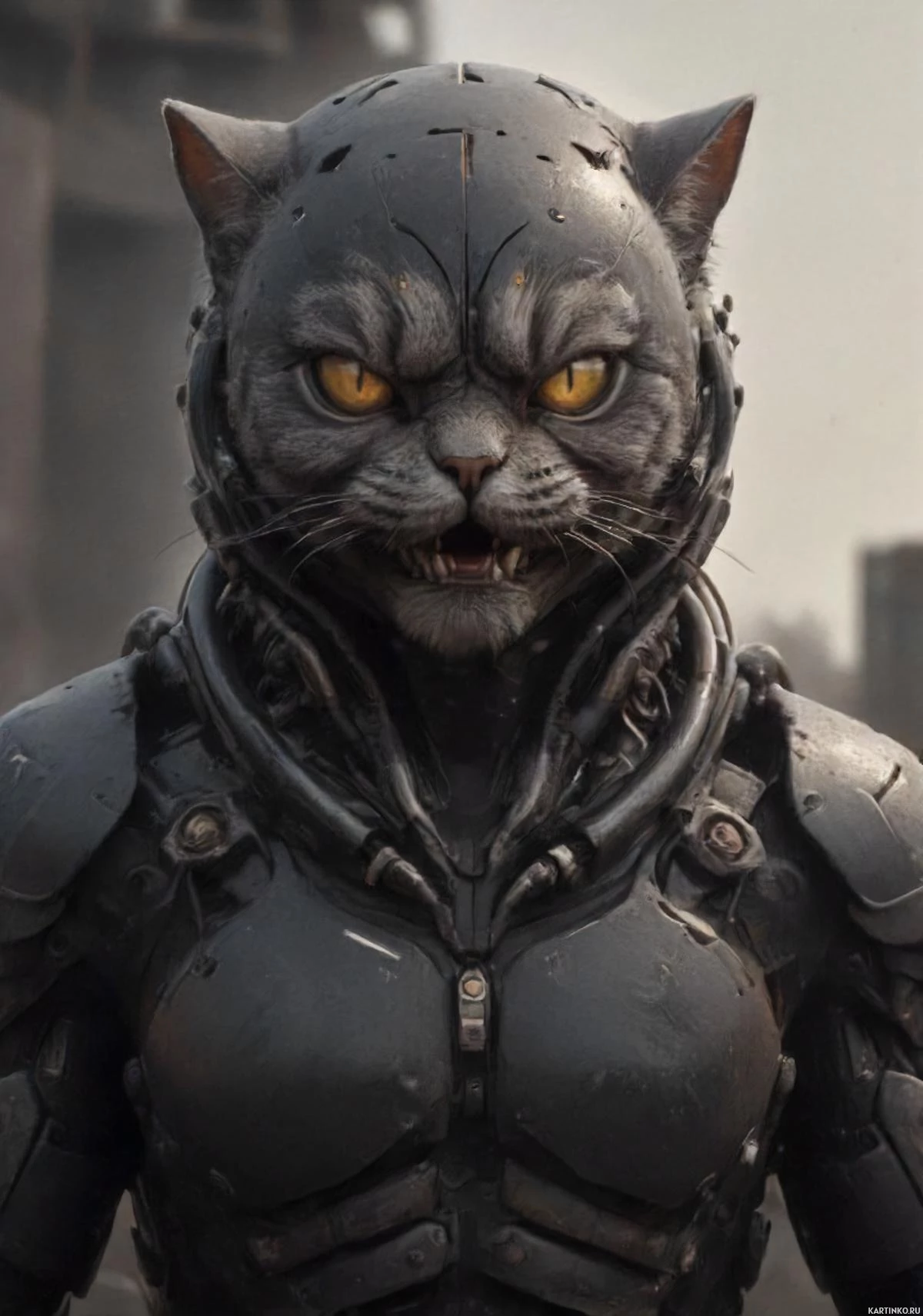 Картинка изображает персонажа в стиле научной фантастики. В центре – гуманоидная фигура с кошачьими чертами: ушками и хвостом. Лицо представляет собой смесь человеческих и кошачьих черт, с текстурой меха, напоминающей кошачью. У фигуры механический торс с видимыми кабелями или трубками, соединяющими различные части костюма. Цветовая гамма доминирована металлическими серыми тонами, контрастирующими с естественными цветами кошачьих черт. Фон минималистичен, без каких-либо заметных объектов или текста.