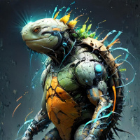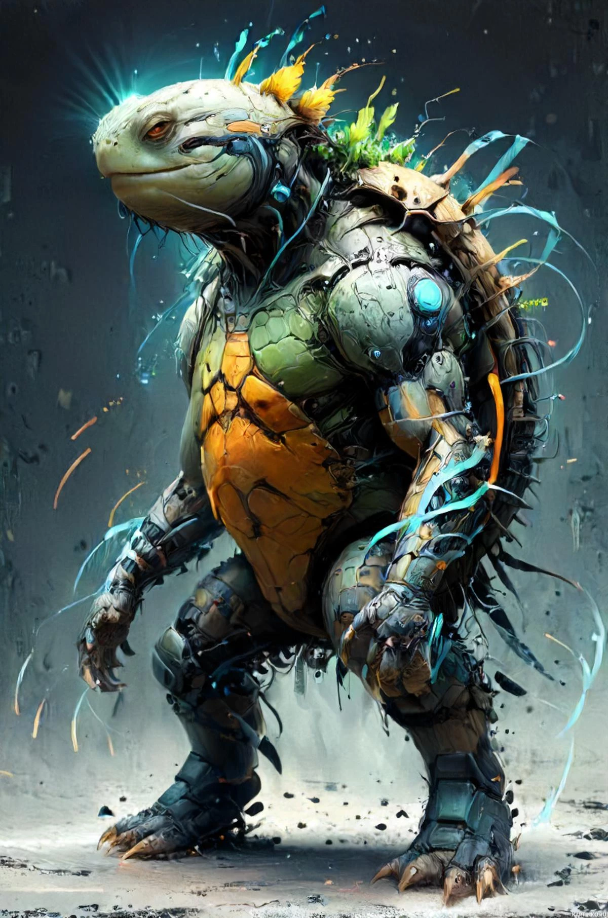 На картинке изображён черепахa в научно-фантастическом стиле, напоминающем гуманоида, стоящего на двух ногах. Черепаха большая, в шлеме и футуристической броне. Его панцирь выглядит грубым и текстурированным, как у обычных черепах, но у него чётко очерченные мышцы на руках и торсе, что говорит о силе. На заднем плане – абстрактный фон с эффектами освещения и всплесками, которые могут намекать на энергию или силу, усиливая общий сказочный характер работы. Стиль картинки сочетает реалистичные пропорции, как у человека, с фантастическими элементами, характерными для научной фантастики.