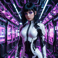 The image features a female character in a science fiction setting. She has long brunette hair and is wearing black, form-fitting armor with white highlights. Her expression appears stern or contemplative as she looks directly at the viewer. Behind her are illuminated panels displaying binary code sequences, indicating that the scene might be taking place in a high-tech environment. The character's attire and the background suggest themes of futuristic technology and potentially cybernetic enhancements.