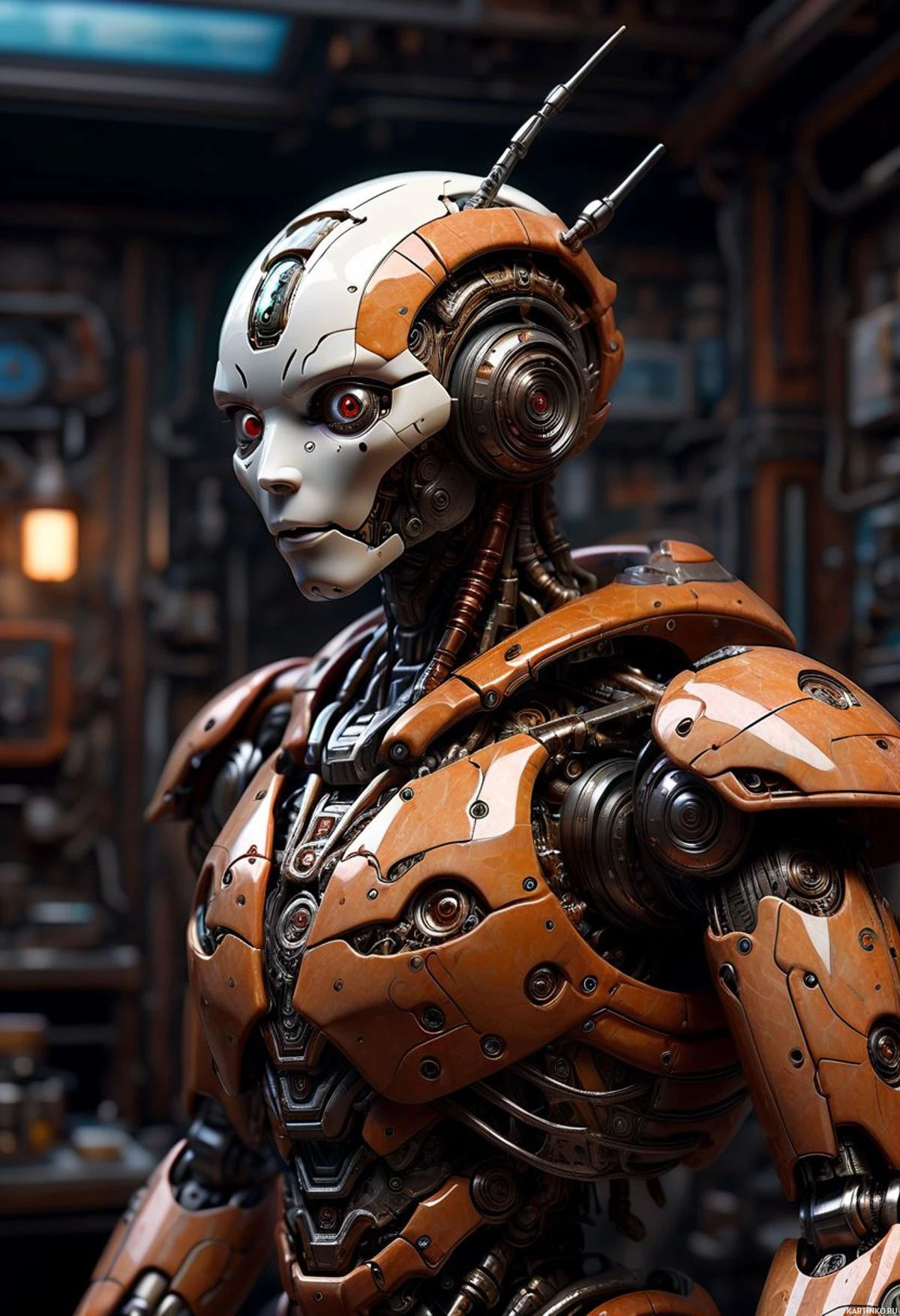 На картинке изображён гуманоидный робот, стоящий прямо в помещении, похоже, промышленном или лаборатории. У робота преобладает оранжево-серебристая цветовая гамма, видны металлические детали и провода на торсе, руках и голове. Его лицо человеческое, с красными глазами, придающими ему жутковатый вид. Заметны механические детали, такие как шестерёнки и, возможно, сервоприводы или суставы на плечах и локтях. Фон указывает на помещение с техническим оборудованием и полками, заполненными инструментами и машинами, что говорит о высокотехнологичной среде.