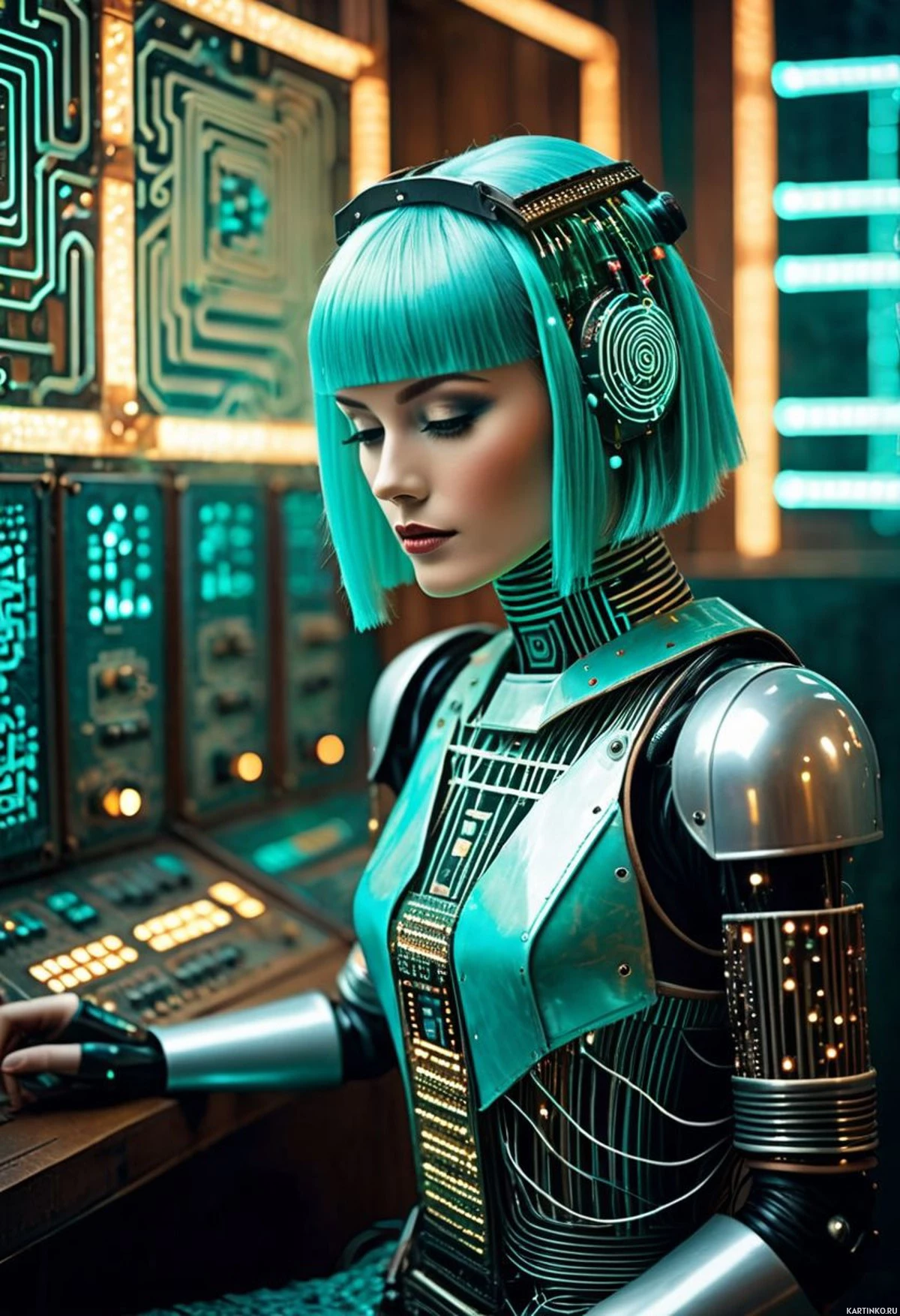 На картинке – гуманоид с бирюзовыми волосами и закрытыми глазами. Судя по всему, он сосредоточенно управляет панелью управления с различными электронными компонентами и экранами. Сеттинг указывает на научно-фантастическую тематику, возможно, в футуристической или высокотехнологичной среде. Выражение лица персонажа сосредоточенное, что говорит о концентрации на выполняемой задаче. Общая композиция картинки передаёт ощущение передовых технологий и исследований.